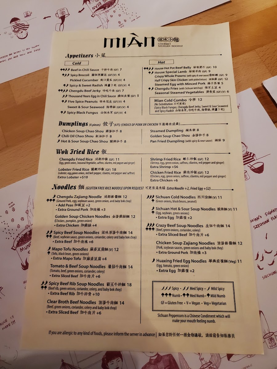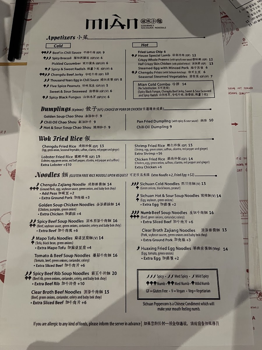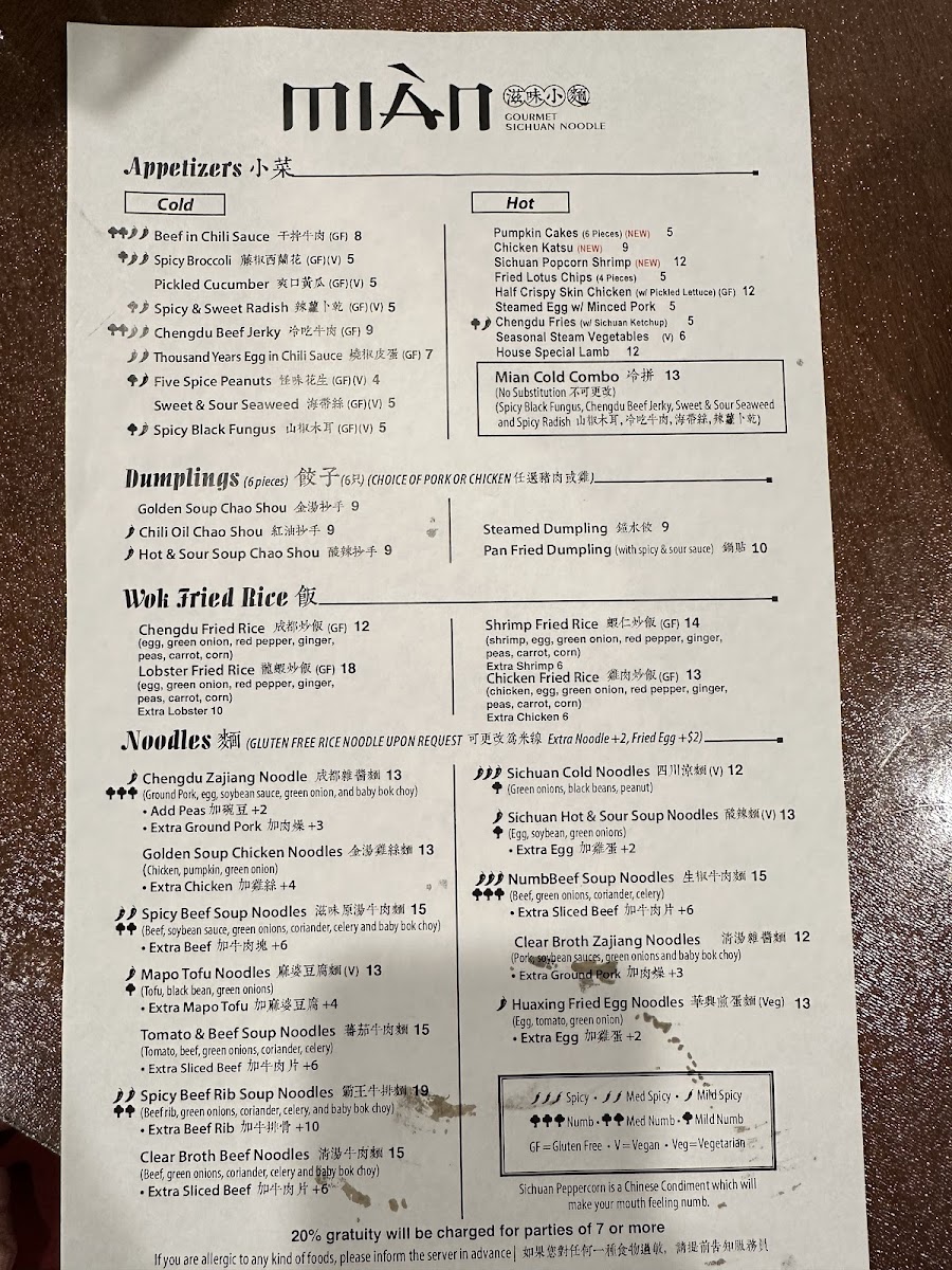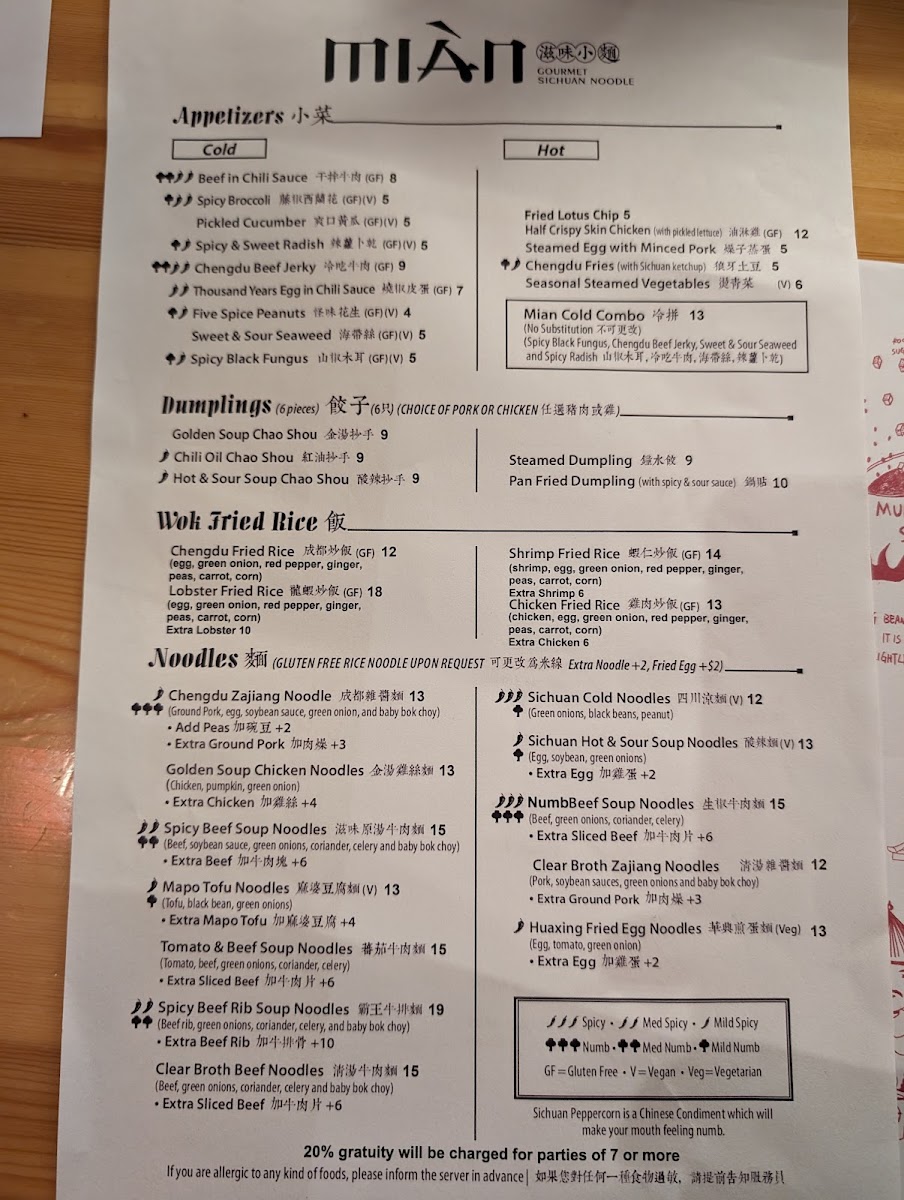 Mian’s Wok Fried Rice dishes like the Shrimp Fried Rice (GF) and Lobster Fried Rice (GF) are rich and flavorful, ideal for seafood lovers. The Chengdu Fried Rice (GF) and Mapotofu Rice (Vegetarian) also provide satisfying options for non-meat eaters.