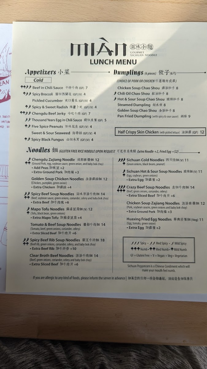 Beef, green onions, coriander, celery. Mild spicy. Contains Sichuan Peppercorn. Substituting the Noodles to Rice Noodle does NOT necessarily make the dish Gluten Free, please consult the server before ordering